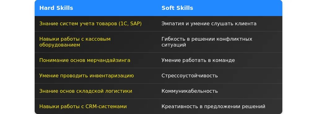Уникальные навыки: разработка стратегий выкладки товаров, повышающих продажи на 20%.