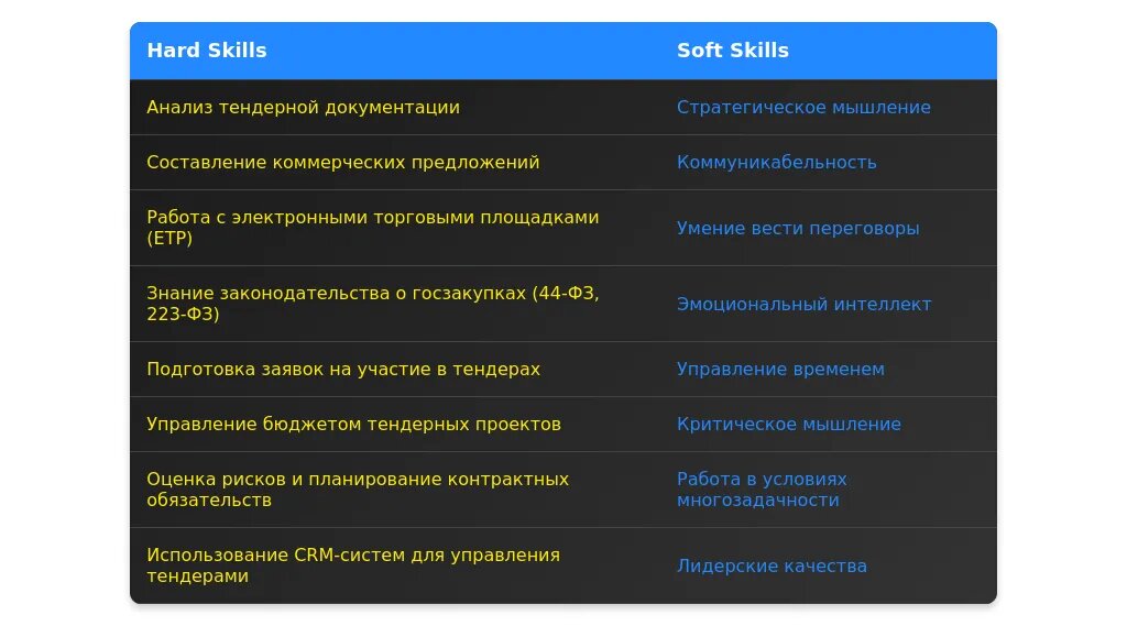 "Опыт работы с ЕИС, коммерческими тендерными площадками и CRM-системами, подготовка тендерной документации в соответствии с 44-ФЗ и 223-ФЗ."
