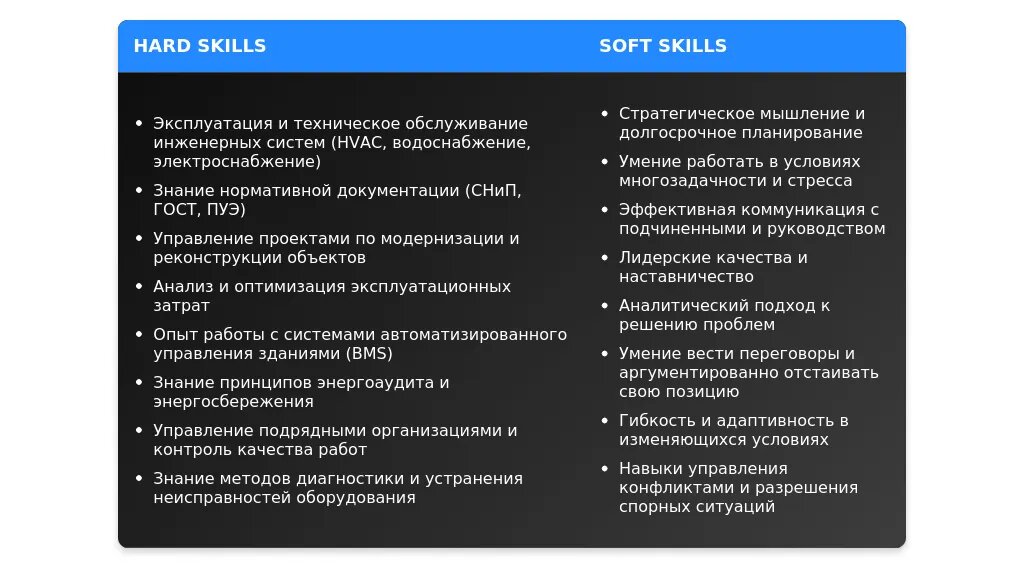 Технические навыки (hard skills) — это ключевые компетенции, которые необходимы для выполнения обязанностей главного инженера по эксплуатации.