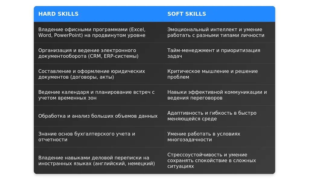 - Ключевые навыки, связанные с должностью (организация, коммуникация, работа с документами).