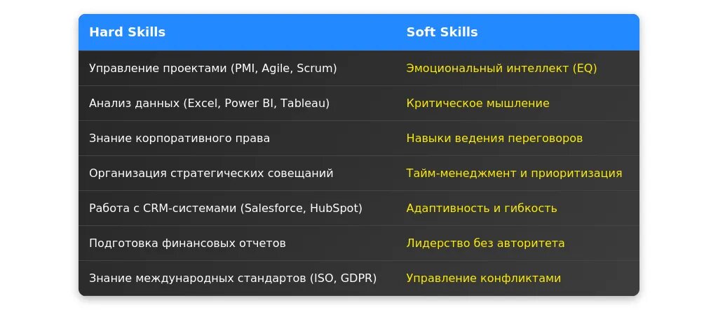 Ключевые компетенции: организация встреч, управление проектами, аналитика данных.