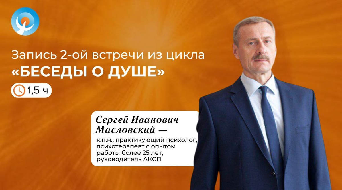 📼 Запись эфира с Сергеем Ивановичем Масловским из цикла "БЕСЕДЫ О ДУШЕ" готова. Обсудили: 🔵что такое душа; 🔵как связаны душа и тело; 🔵действительно ли тело это дом души; 🔵как душа проявляется через тело. Забрать запись 🔜ЗДЕСЬ. 🕊 Будем рады, если расскажете в комментариях о своих впечатлениях после просмотра.