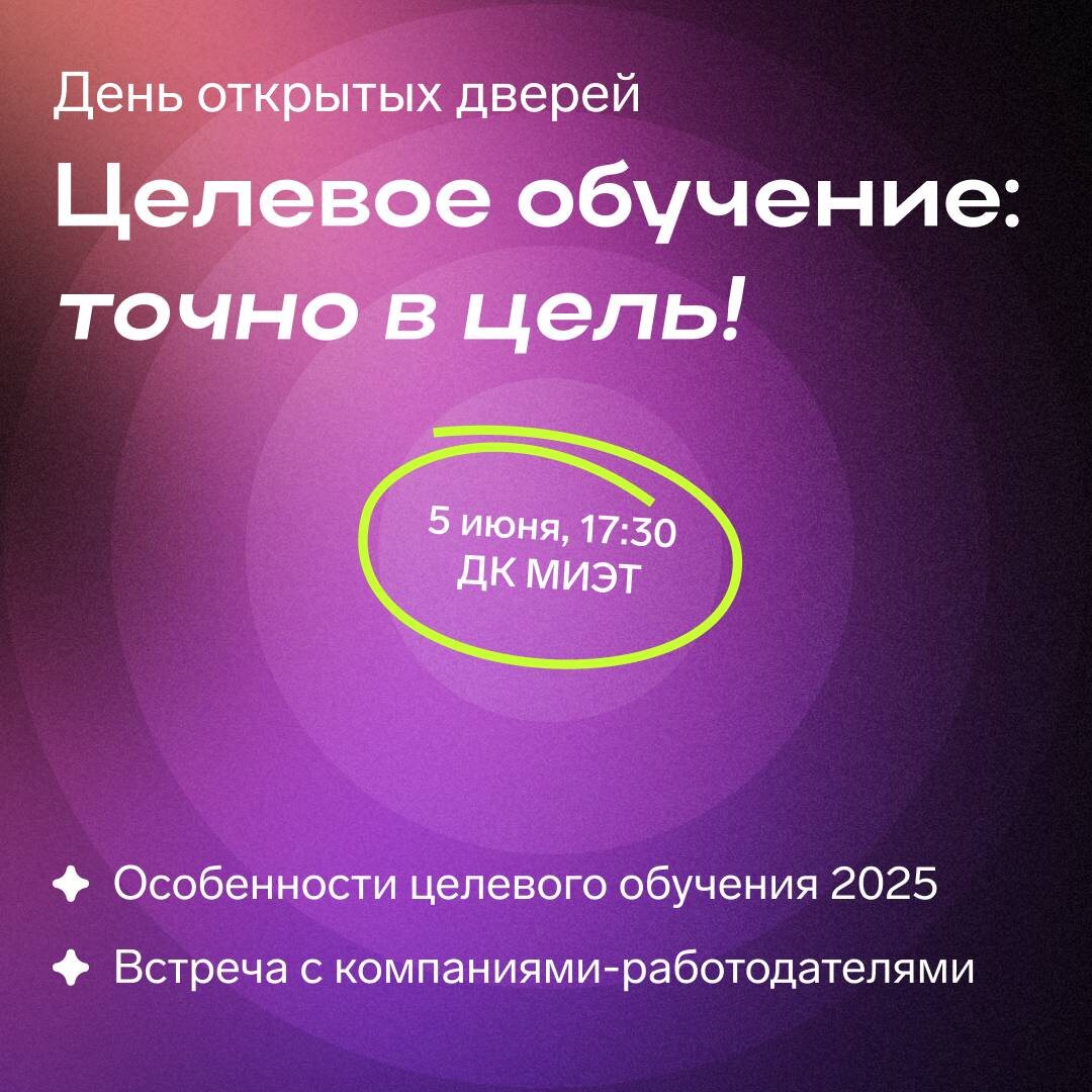 📣 Расскажем всё о целевом! 5 июня приглашаем абитуриентов и их родителей на День открытых дверей, посвященный приему на целевое обучение. Программа мероприятия: 💙 17:30–20:00 — работа стендов направлений подготовки; — консультации с представителями компаний-работодателей; — консультации с экспертами Приемной комиссии МИЭТ. 💙18:00–18:45 — выступление заместителя председателя Приемной комиссии МИЭТ Александра Балашова; — подробная информация о целевом приеме 2025; — ток-шоу с работодателями «Точно в цель». Если вы пропустили апрельский День открытых дверей — это отличная возможность лично встретиться с представителями университета и работодателями! ❗️Регистрация: open.miet.ru/