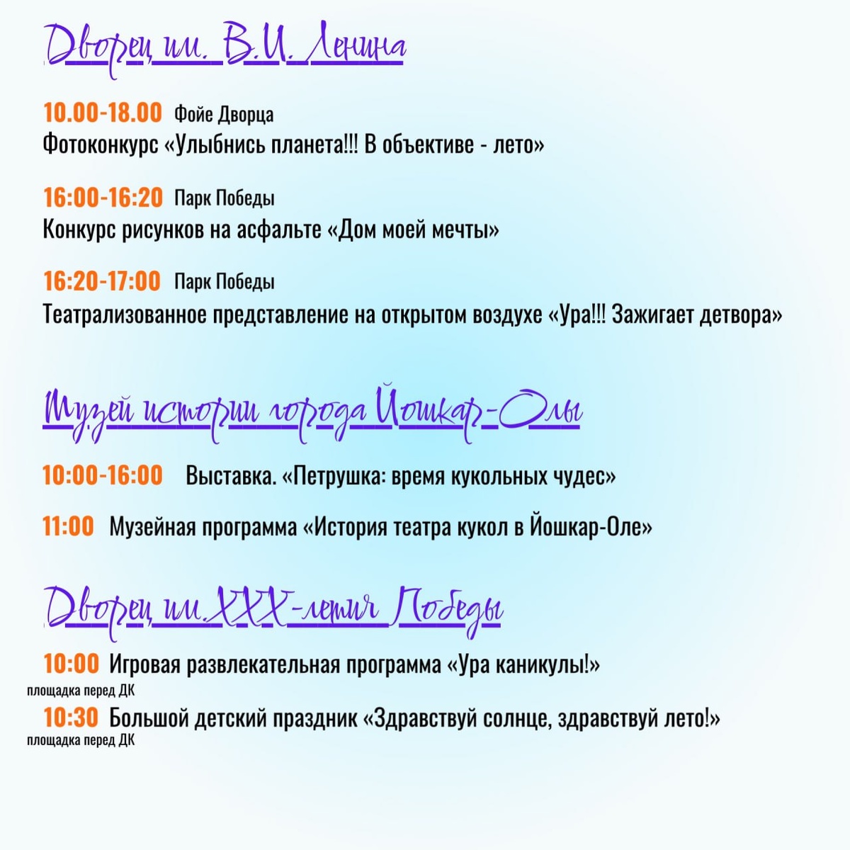 ΠΈ Π΄Π΅ΡΠ΅ΠΉ Π½Π° ΠΏΡΠ°Π·Π΄Π½ΠΈΠΊ 1 ΠΈΡΠ½Ρ! ΠΠ΄ΠΌΠΈΠ½ΠΈΡΡΡΠ°ΡΠΈΡ Π³ΠΎΡΠΎΠ΄Π° ΠΎΠΏΡΠ±Π»ΠΈΠΊΠΎΠ²Π°Π»Π° Π½Π°ΡΡΡΠ΅Π½Π½ΡΡ Π°ΡΠΈΡΡ ΠΊΠΎ ΠΠ½Ρ Π·Π°ΡΠΈΡΡ Π΄Π΅ΡΠ΅ΠΉ. ΠΠ»Ρ Π³ΠΎΡΠΎΠΆΠ°Π½ ΠΏΠΎΠ΄Π³ΠΎΡΠΎΠ²Π»Π΅Π½Ρ ΠΊΠΎΠ½ΠΊΡΡΡΡ, ΠΊΠΈΠ½ΠΎΠΏΠΎΠΊΠ°Π· ΠΈ Π΄ΡΡΠ³ΠΈΠ΅ ΡΠ°Π·Π²Π»Π΅ΡΠ΅Π½ΠΈΡ.