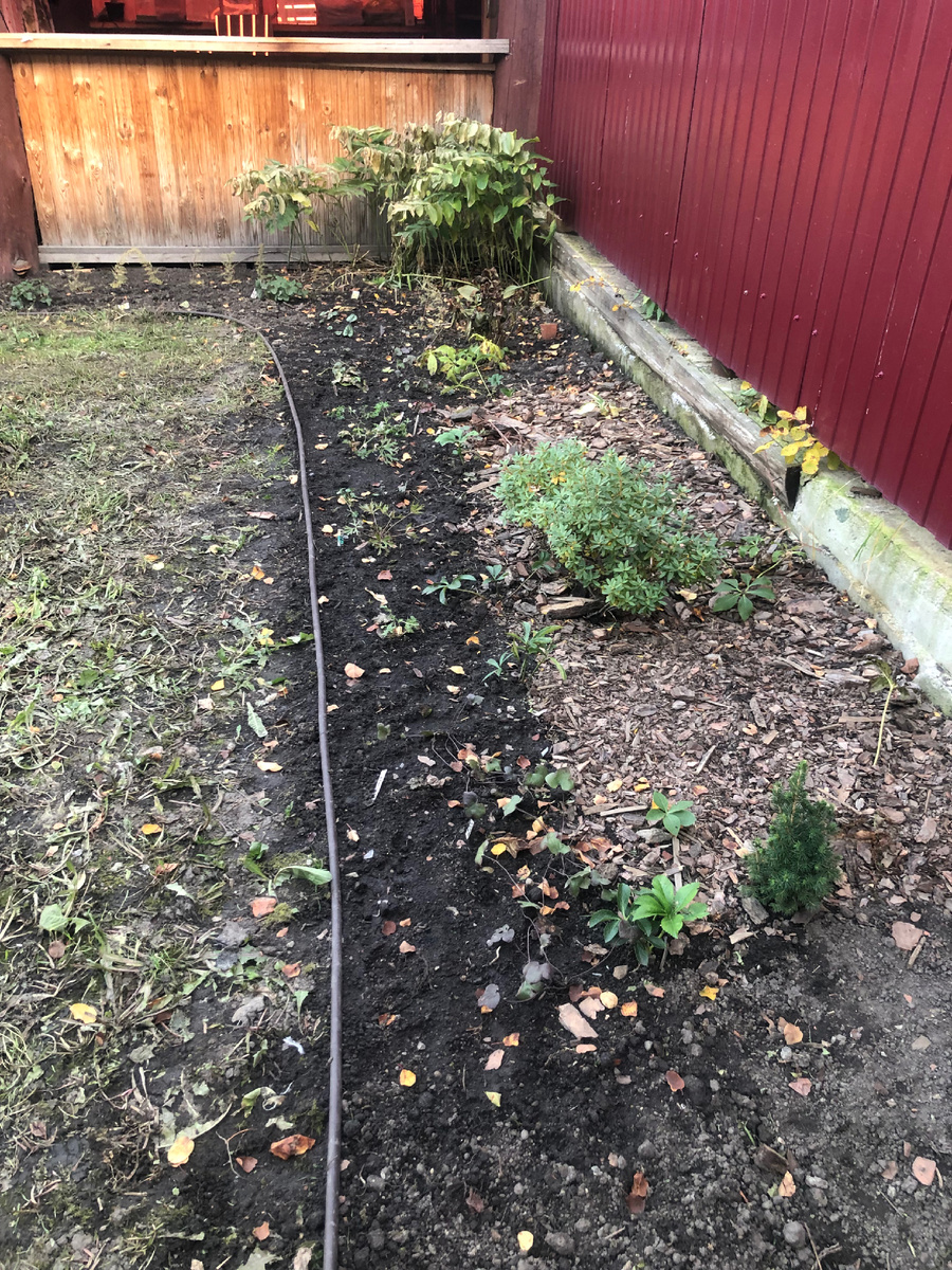 Всем привет, я - Галина, и я люблю цветы. Можно ли пересаживать взрослый куст рододендрона летом? Если меня об этом спросят, то я скажу, что нельзя. Вам то скажу, а сама… Сама я пересаживаю и перетаскиваю все, что надумаю и когда меня осенит. Так вот, прошлое лето я решила пересадить рододендрон плотный , большой взрослый куст. Как раз купила бордюрную ленту и решила облагородить территорию во дворе. Понемногу перетаскивала туда растения. На фото уже сентябрь, но рододендрон я в августе туда утащила. На старом месте было слишком сухо и солнечно для него. Деревьев у меня почти нет, тень в дефиците, а здесь тенек от забора. И вообще это место темное и мрачное, солнце лишь на короткое время заглядывает в этот угол. Рододендрон вполне хорошо себя чувствовал , я замульчировала его сосновой корой. Листья у этого представителя вересковых вечнозеленые. Это низкий подушковидный вид. Пришла весна и я обнаружила , что половина рододендронового куста лысая. Вечнозеленые листики родика скрутились