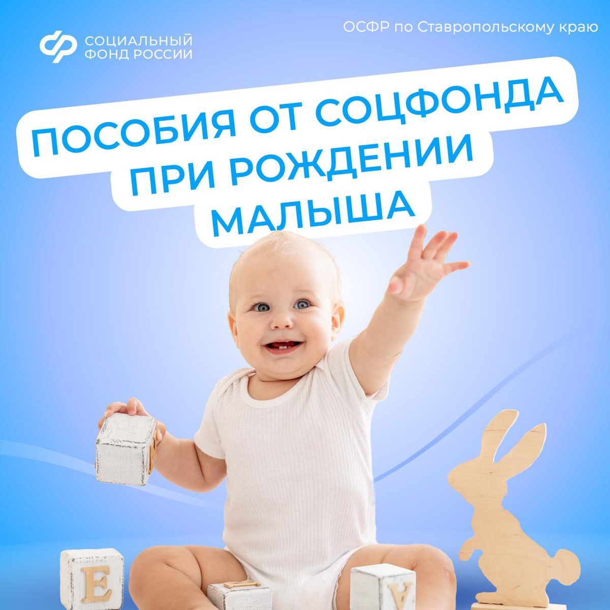 При рождении ребенка можно получить до 5 пособий Отделение СФР по Ставропольскому краю оказывает поддержку семьям в период подготовки к появлению малыша и почти до совершеннолетия ребенка. Способы оформления пособий и размеры выплат зависят от того, работала будущая мама или нет. Работающие мамы Ставрополья могут получать: ⏹️ единовременное пособие при рождении ребенка ⏹️ пособие по уходу за ребенком до 1,5 лет ⏹️ пособие по беременности и родам ✅ единое пособие от 0 до 17 лет (если доход семьи ниже регионального прожиточного минимума после комплексной оценки нуждаемости) ✅ ежемесячная выплата из материнского капитала (если доход на каждого человека в семье ниже 2 прожиточных минимумов) Неработающие мамы Ставрополья могут получать: ✅ единовременное пособие при рождении ребенка ✅ единое пособие от 0 до 17 лет (необходимо обосновать отсутствие дохода объективными жизненными обстоятельствами) ✅ пособие по уходу за ребенком до 1,5 лет (если не получает единое пособие от 0 до 17 лет)