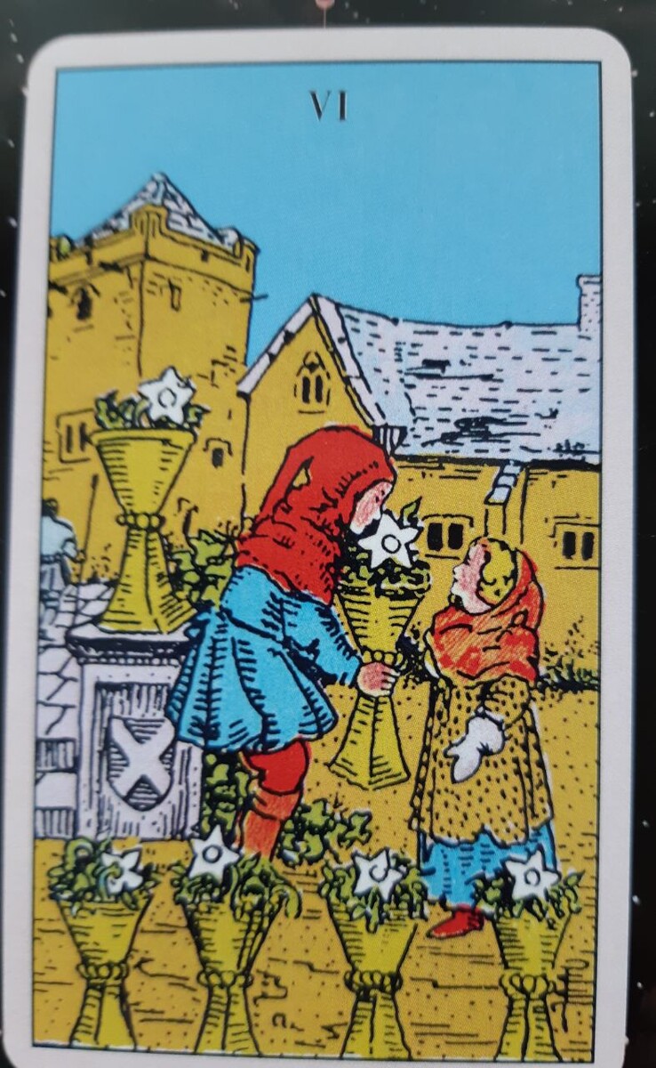 Шестерка Кубков – это карта ностальгии, приятных воспоминаний и возвращения к простым радостям. Она дышит атмосферой детства, беззаботности и искренней дружбы. На карте часто изображены дети, обменивающиеся цветами или играющие в тихой, умиротворяющей обстановке. В контексте "карты дня" появление Шестерки Кубков предвещает день, наполненный теплом и уютом. Возможно, вы встретите старых друзей, услышите хорошие новости от близких или просто почувствуете потребность окунуться в приятные воспоминания. Этот день благоприятен для: Возобновления старых связей: Позвоните давнему другу, напишите бывшему однокласснику, запланируйте встречу с теми, кто дорог вашему сердцу. Занятий, приносящих радость: Посмотрите любимый фильм из детства, послушайте музыку, которая напоминает вам о счастливых моментах, займитесь хобби, которым давно не уделяли времени. Проявления заботы и доброты: Сделайте что-то хорошее для других, особенно для тех, кто нуждается в вашей поддержке. Поделитесь своим теплом и вним