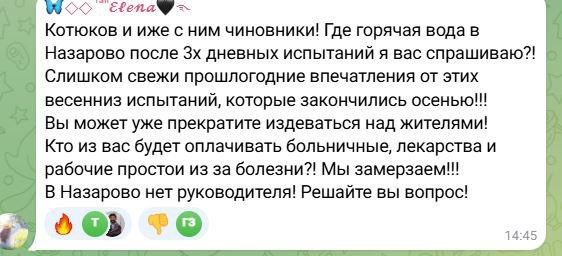 Назаровцы завалили чат губернатора края жалобами на отсутствие горячей воды Без горячей воды сегодня больницы, детские сады, школы и жилые дома. Люди мерзнут и злятся, что энергетики не смотрят прогноз погоды, а ведь синоптики обещали заморозки. Назаровцы считают, что следовало дождаться тепла и только тогда испытывать сети на прочность. "В Назарово снова проблема с подачей горячей воды после гидравлических испытаний! Люди замерзают, они не собираются возвращать воду в дома! Все прошлое лето не было воды и снова порывы, там где была замена труб! Когда это закончится?! Вы вообще проблемы решать можете?!" "Да никто ничего решать не будет, сами с водой на морях где нибудь загорают" "Сейчас дотянут до планового отключения на якобы 2 недели и это будет сделано СПЕЦИАЛЬНО! РЕШАЙТЕ ВОПРОС, В ЭТОТ РАЗ МЫ НАСТРОЕНЫ РЕШИТЕЛЬНО И БУДЕМ ОБРАЩАТЬСЯ В ВЫШЕСТОЯЩИЕ ИНСТАНЦИИ! Вода должна быть подана СЕГОДНЯ! И ни днём позже! А ремонтировать нужно в запланированое 2х недельное время!" "Да это просто