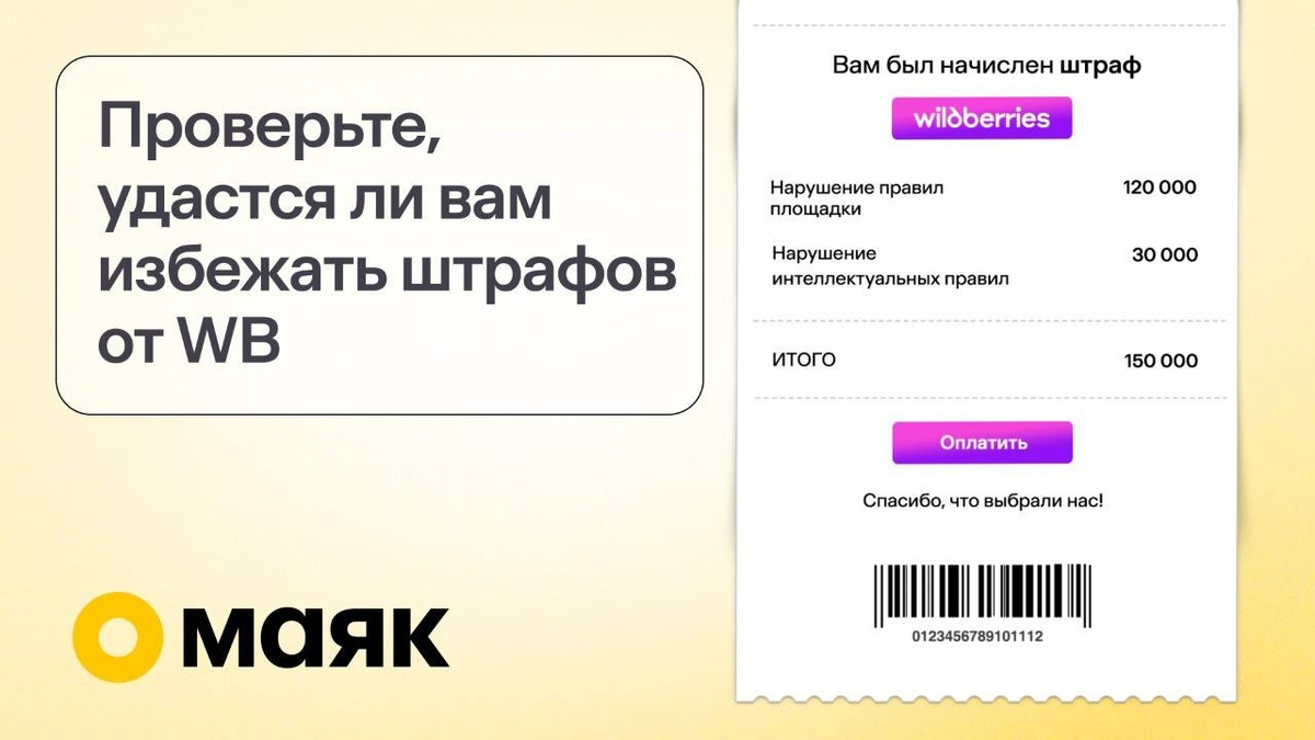 Узнайте, насколько хорошо вы разбираетесь в правилах работы с Wildberries и сможет ли ваш бизнес избежать неприятных штрафов. Мы подготовили для вас короткий, но очень полезный тест! Ответьте на 7 каверзных вопросов и узнайте, насколько ваш бизнес защищён от штрафов и финансовых рисков при работе с маркетплейсом. P.S. После прохождения теста вы получите приятный бонус — бесплатную диагностику вашего бизнеса, которая поможет выявить слабые места и обнаружить точки роста для успешной работы на Wildberries.