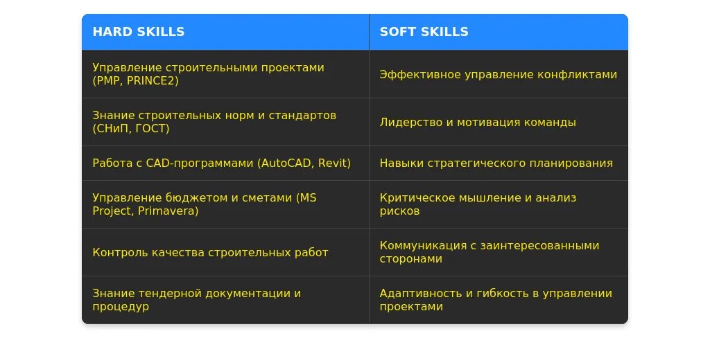 На что делать акцент: базовые знания в строительстве, навыки работы с документацией, умение работать в команде.