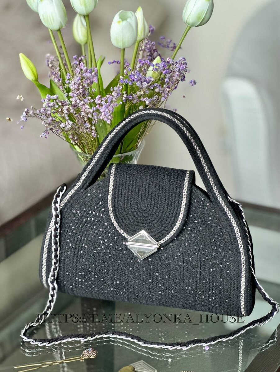 Новиночка!🥳 Знакомьтесь! Сумочка «на выход», для вечерних образов! Создана для придания изысканности и шика в любой наряд. Сумочка необычной формы, сшита из хб шнура с добавлением нитки с пайетками, отделка сделана из декоративного витого шнура серебристого цвета. Лёгкий блеск придаёт сумочке роскошный вид, а обладательнице ощущение праздника. Несмотря на компактные размеры, сумка предлагает достаточно пространства для хранения всех необходимых вещей: телефона, косметики, ключей. Удобная цепочка позволяет носить её как в руке, так и на плече. А классический чёрный цвет позволяет выбрать её к любому стилю одежды. ✨Повтор сумочки возможен для заказа. ✨К каждой сумочке индивидуальный подход. ✨Не упустите шанс стать обладательницей такого аксессуара! #подаркиручнойработы #женскиесумки #сумкаизшнура #подарокдлялюбимой #алёнкашьёт