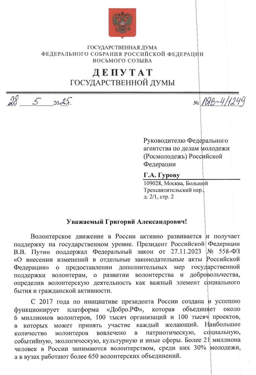 ❤️Предложила расширить региональный функционал платформы "Добро.рф" 📩 Направила соответствующее письмо главе Росмолодежи Григорию Гурову. ℹ️Система "Добро.рф" успешно функционирует и является важным инструментом для координации добровольцев по всей стране. Однако федеральная площадка, не создает условий для координации волонтеров на микроуровне, в результате чего регионы вынуждены делать это за счет своих ресурсов. 🖥Предлагаю создать в федеральной системе "Добро.рф" единую сеть региональных ресурсных центров, которая бы позволила просматривать списки волонтеров в регионах и устанавливать контакты с местными волонтерами, занятыми в реализации отдельных муниципальных проектов, организовывать партнерства волонтерских организаций непосредственно внутри платформы. 🖥Это позволит отказаться от поддержки отдельных цифровых экосистем в каждом регионе, что, в свою очередь, сократит расходы, дублирование функций и обеспечит единые стандарты координации волонтерского движения.