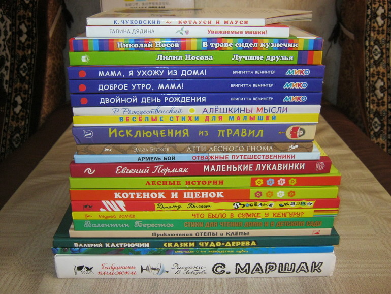 Из объемных книг произведения читались выборочно, плюс начитали стопку тонких книжек. Ко всему этому постоянно ежедневно таскались и перечитывались порой по несколько раз в день картонки со сказками и стихами.