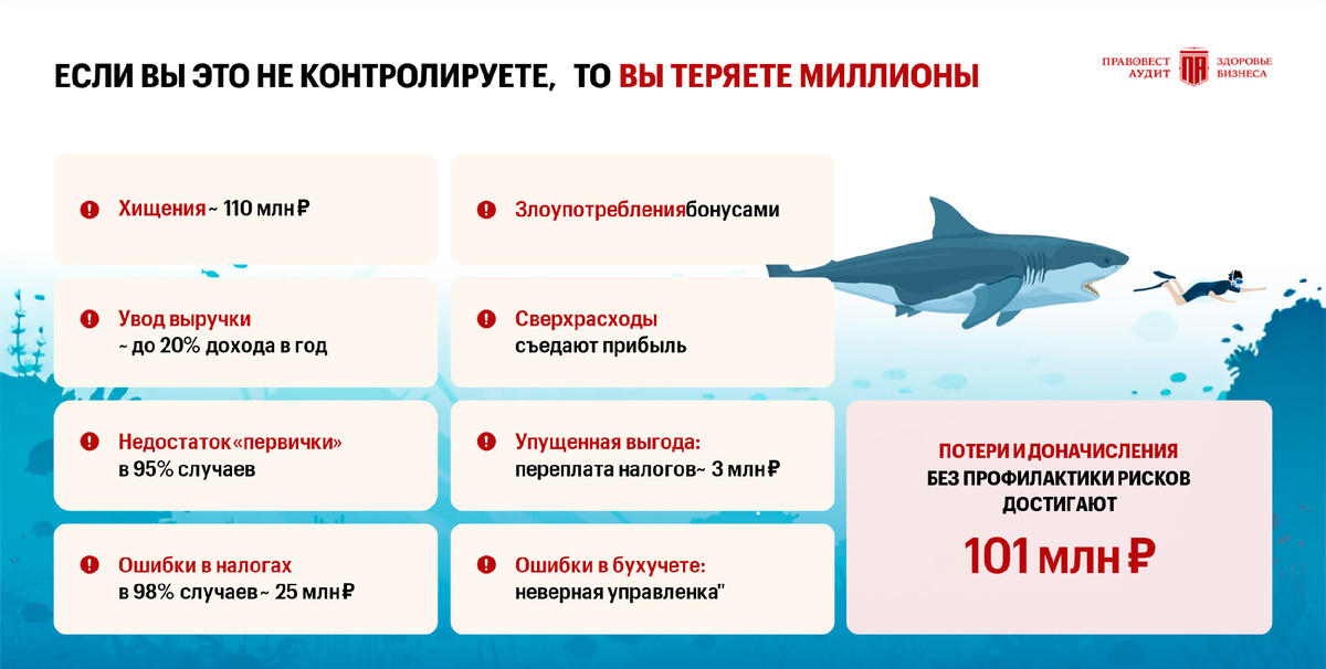 Аудит становится инструментом выявления и устранения налоговых ошибок до проверки ФНС. Это позволяет существенно снизить риски доначислений и штрафов. Компании используют аудит для профилактики налоговых и финансовых рисков, а не только для формального выполнения законодательных требований. Это подтверждает рост спроса на инициативный аудит в 2024 году. В «Правовест Аудит» - это основной тренд 2025 года. Причем летом можно провести экспресс-диагностику рисков, доступную по цене даже малому бизнесу. Конечно, она не заменит аудит с углубленной проверкой налогового учета, но обозначит основные налоговые риски компании.
