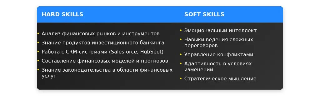 После адаптации: "Навыки продаж финансовых продуктов, работа с CRM-системами (Salesforce, HubSpot), знание английского языка на уровне Advanced."