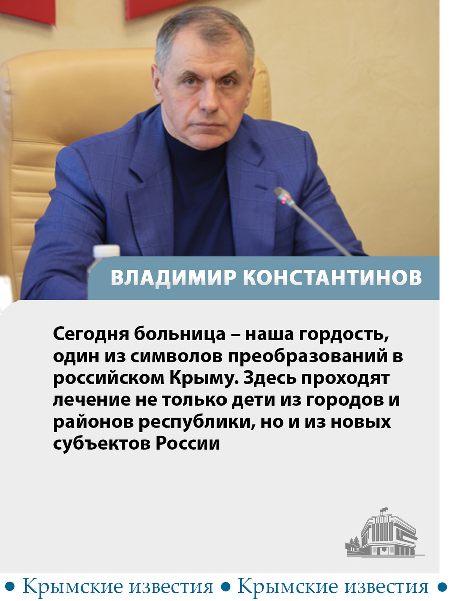 🏥 РДКБ объединится с детской инфекционной больницей с 1 июля. Здание последней сегодня нуждается в ремонте. В здании Республиканской детской клинической больницы же капитальный ремонт сделали только в прошлом году. «Это — результат нашей совместной работы с главой Республики Крым Сергеем Аксёновым и Совмином Крыма. Активное участие в этих процессах принимал наш попечительский совет и благотворительный фонд "Будем милосердны"», – отметил Владимир Константинов. Кроме того, 370 юных пациентов больницы получили сладкие подарки от главы крымского парламента. Крымские известия. Больше новостей
