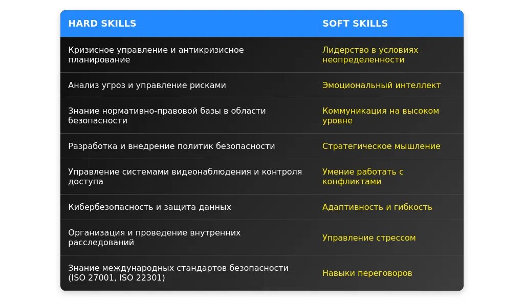 Soft skills — это личные качества, которые помогают эффективно работать в команде и управлять процессами. Топ-10 soft skills для директора службы безопасности: