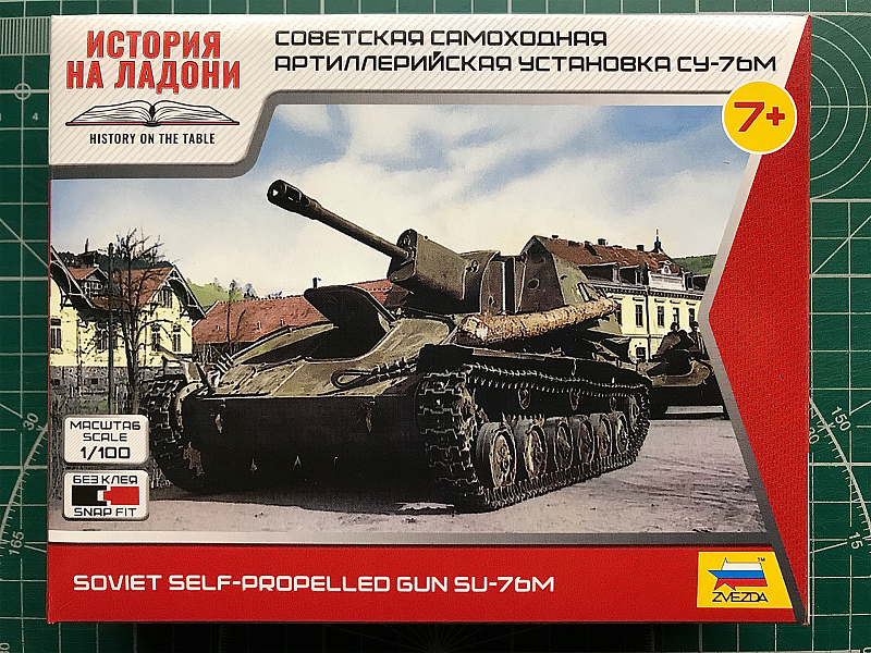 Доброго времени суток! Ни разу не "танковод"... но, на приобритение данного набора меня подталкнул случай, скажем так. Очередной раз просматривая старые фотографии фронтовой юности моего деда, я наткнулся на коллективную фотографию(вероятно уже послевоенную), где за спинами личного состава стояло бтт, которое я никак(к своему незнанию) долгое время не мог определить... В данном случае, речь идёт о советской САУ СУ-76М от Zvezda. Очередная коробочка с маленьким грозным "клопиком" в масштабе 1:100. Набор с моделью упакован в коробку 16х13х4см в дизайне серии "ИСТОРИЯ НА ЛАДОНИ" с фотографией реального прототипа в качестве бокс-арта. Хотя, на самом деле... Это всё та же модель перекочевавшая из игровой серии Великая Отечественная WWII (Art of Tactic). Присутствует всё тот же игровой флажок отряда на литниках и отверстие под него в ванне корпуса самоходки. Насколько мне известно, "Звезда" относительно недавно(в 2023 году) выпустила неплохую модель данной самоходки в масштабе 1/35, ко