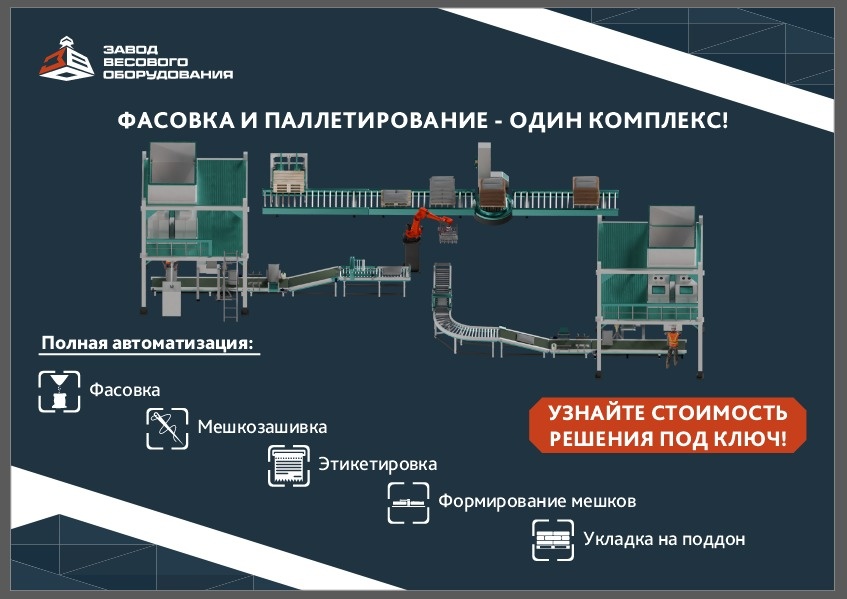 Снижение зависимости от человеческого фактора, повышение точности, скорости и устойчивости процессов - всё это становится не просто преимуществом, а необходимым условием конкурентоспособности. В этом году ООО «Завод весового оборудования» впервые примет участие в крупнейшей международной выставке упаковочной индустрии RosUpack 2025, которая пройдёт в Москве. Мы с гордостью представим наши линии - роботизированный комплекс для фасовки в биг-бэги с промышленной рукой-манипулятором и автоматическая линия фасовки в открытые мешки сыпучих материалов с паллетоукладчиком. Сегодня уже нельзя говорить об автоматизации как о «новом веянии». Это устоявшаяся и жизненно важная стратегия развития для предприятий, стремящихся к устойчивости и масштабированию. Однако лишь автоматизация и роботизация отдельных этапов - это половина дела. Реальный эффект даёт комплексный подход, когда оборудование не просто выполняет задачи, а объединяет в себе логически связанные процессы в единую экосистему. От сырья