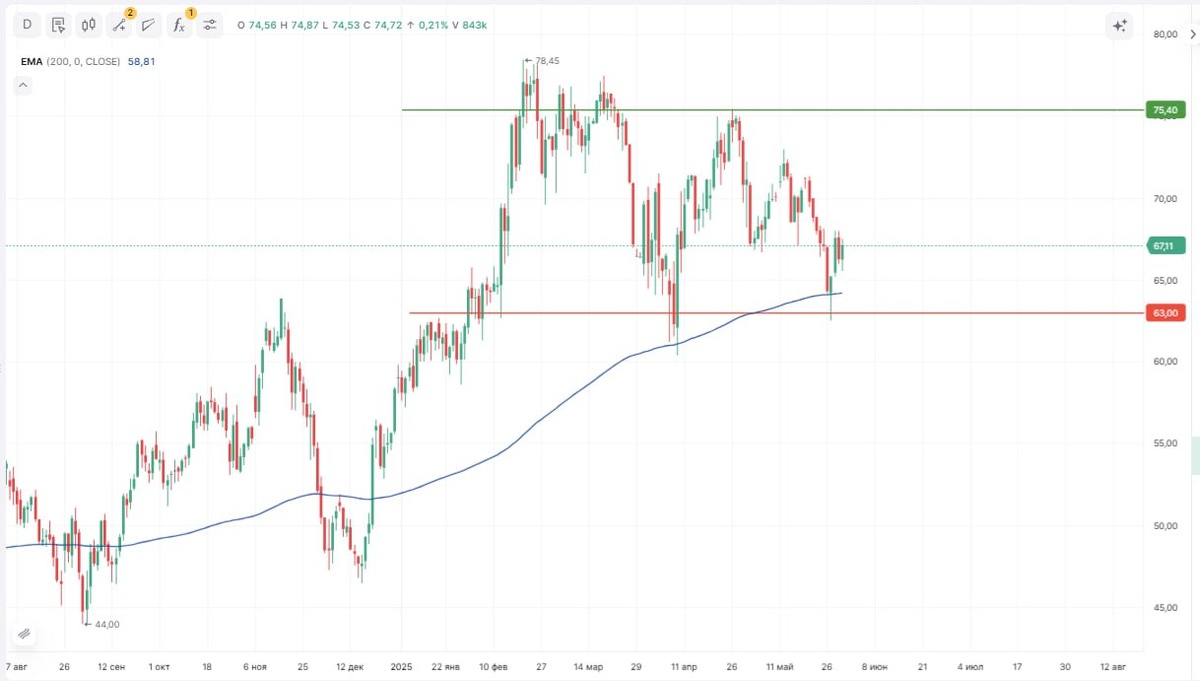 📈 ПАО «Аэрофлот» Тикер: #AFLT Идея: Long ⬆️ Срок идеи: 1-2 месяца Цель: 75,4 руб. Потенциал идеи: 12,5% Объем входа: 7% Стоп-приказ: 63 руб. 📊 Технический анализ Акции демонстрируют долгосрочный восходящий тренд, торгуясь выше 200-дневной скользящей средней. Идея на рост бумаги с целью 75,4 руб. При объеме позиции в 7% и выставлении стоп-заявки на уровне 63 руб. риск на портфель составит 0,42%. Соотношение прибыль/риск составляет 2,10. ✈️ Фундаментальный фактор Группа #Аэрофлот — крупнейшая авиационная группа России. В состав Группы входят сетевые авиакомпании «Аэрофлот» и «Россия», лоукостер «Победа», а также профильные сервисные предприятия, занимающиеся техническим обслуживанием воздушных судов, предоставлением бортового питания, гостиничных услуг, а также обучением работников. «Аэрофлот» сегодня должен представить результаты за I квартал 2025 года по МСФО, а также опубликовать решение совета директоров по дивидендам. Ожидаем сильных показателей на фоне роста пассажиропотока и