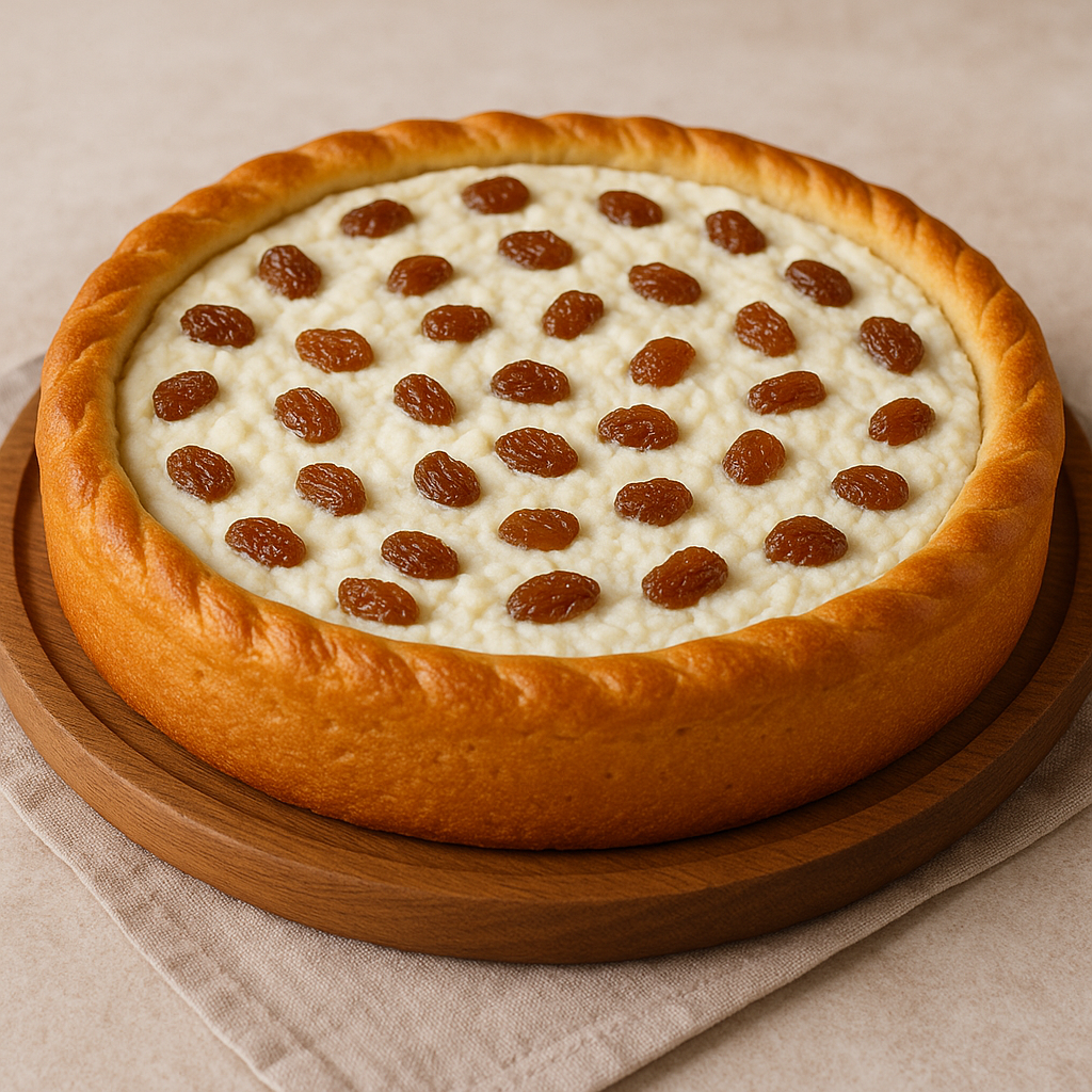 Ингредиенты: Для теста: Для начинки: Приготовление: Подготовка начинки: 1. Изюм замочите в теплой воде на 15 минут, затем хорошо обсушите на бумажном полотенце, чтобы не было лишней влаги. 2. В миске смешайте творог с сахаром, ванильным сахаром и яйцом. Тщательно перемешайте до однородности. 3. Добавьте изюм и аккуратно перемешайте. Приготовление теста: 1. Просейте муку вместе с разрыхлителем и щепоткой соли в большую миску. 2. Нарежьте холодное сливочное масло на небольшие кусочки и порубите с мукой ножом или смешайте в комбайне до состояния мелкой крошки. 3. В отдельной миске взбейте яйца с сахаром и ванильным сахаром до легкой пышной массы. 4. Добавьте сметану и перемешайте. 5. Соедините жидкую смесь с мучной крошкой и быстро замесите тесто. Оно должно быть мягким и не слишком липким. Если слишком липнет — немного подсыпьте муки. 6. Разделите тесто на две части: примерно 2/3 и 1/3. Формирование пирога: 1. Форму для выпечки (примерно 24 см в диаметре) смажьте сливочным масло