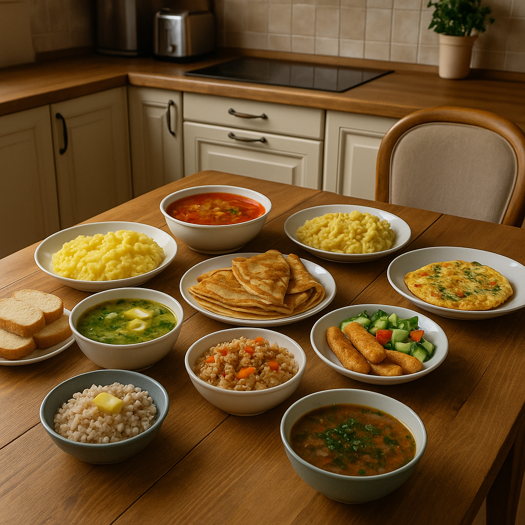 Завтрак: Ячневая каша с маслом и сахаром 🍯 Обед: Щавелевый суп (или зелёные щи) + яйцо 🥣 Ужин: Картофельное пюре + куриные котлеты 🥔🍗 Завтрак: Бутерброды с плавленым сыром 🧀 Обед: Суп с вермишелью и овощами 🍜 Ужин: Тушёные кабачки с фаршем или без 🍲 Завтрак: Творожная масса с изюмом 🍥 Обед: Гречневый суп + чёрный хлеб 🍲 Ужин: Рис с курицей и овощами 🍛 Завтрак: Овсянка на воде с бананом 🍌 Обед: Рассольник с перловкой 🍲 Ужин: Запеканка из макарон с сыром и яйцом 🍝 Завтрак: Блины с джемом или мёдом 🥞 Обед: Рагу овощное (картофель, морковь, лук) 🌿 Ужин: Рыбные палочки/котлеты + салат из свежих овощей 🐟 Завтрак: Манка с молоком и вареньем 🍓 Обед: Борщ (можно без мяса) 🍲 Ужин: Картофельники с фаршем или просто 🥔 Завтрак: Творожные сырники + чай 🍵 Обед: Лапша с курицей в бульоне 🍜 Ужин: Омлет с овощами 🥚 Овощи: картофель, морковь, лук, капуста, кабачки, щавель, свёкла. Фрукты на перекусы: яблоки, груши, бананы. Молочка: творог, молоко, сыр, плавленый сыр, сметана, йогурт