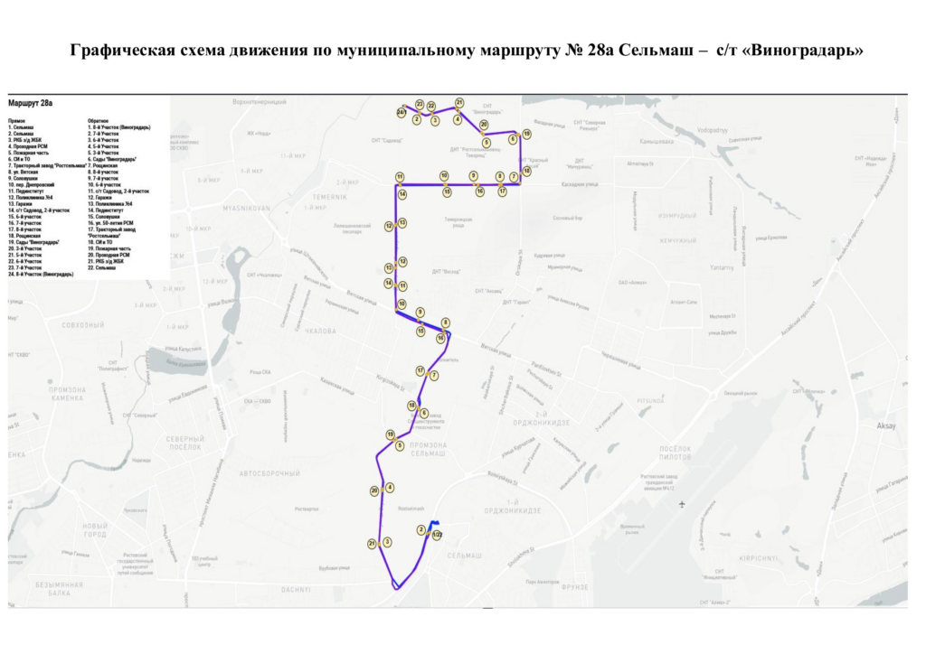 На линии будет работать автобус среднего класса «ЛиАЗ-4292 «Курсор», который ранее был передан из Москвы. Новый маршрут улучшит транспортную доступность в районе улицы Орской. Одновременно с этим ООО «Карат» прекращает обслуживание маршрута №19 «Стартовая – площадь Карла Маркса», который проходил по улице Страны Советов. Департамент транспорта будет искать нового перевозчика на это направление. Схема остановок нового маршрута №28: В прямом направлении: Сельмаш – Сельмаш – РКБ з/д ЖБК – Проходная РСМ – Пожарная часть – СИ и ТО – Тракторный завод «Ростсельмаш» – ул. Вятская – Соловушки – пер. Днепровский – Пединститут – Поликлиника №4 – Гаражи – c/т Садовод, 2-й участок – 6-й участок – 7-й участок – 8-й участок – Рощинская – Сады «Виноградарь» – 3-й Участок – 5-й Участок – 6-й Участок – 7-й Участок – 8-й Участок (Виноградарь). В обратном направлении: 8-й Участок (Виноградарь) – 7-й Участок – 6-й Участок – 5-й Участок – 3-й Участок – Сады «Виноградарь» – Рощинская – 8-й участок – 7-й учас