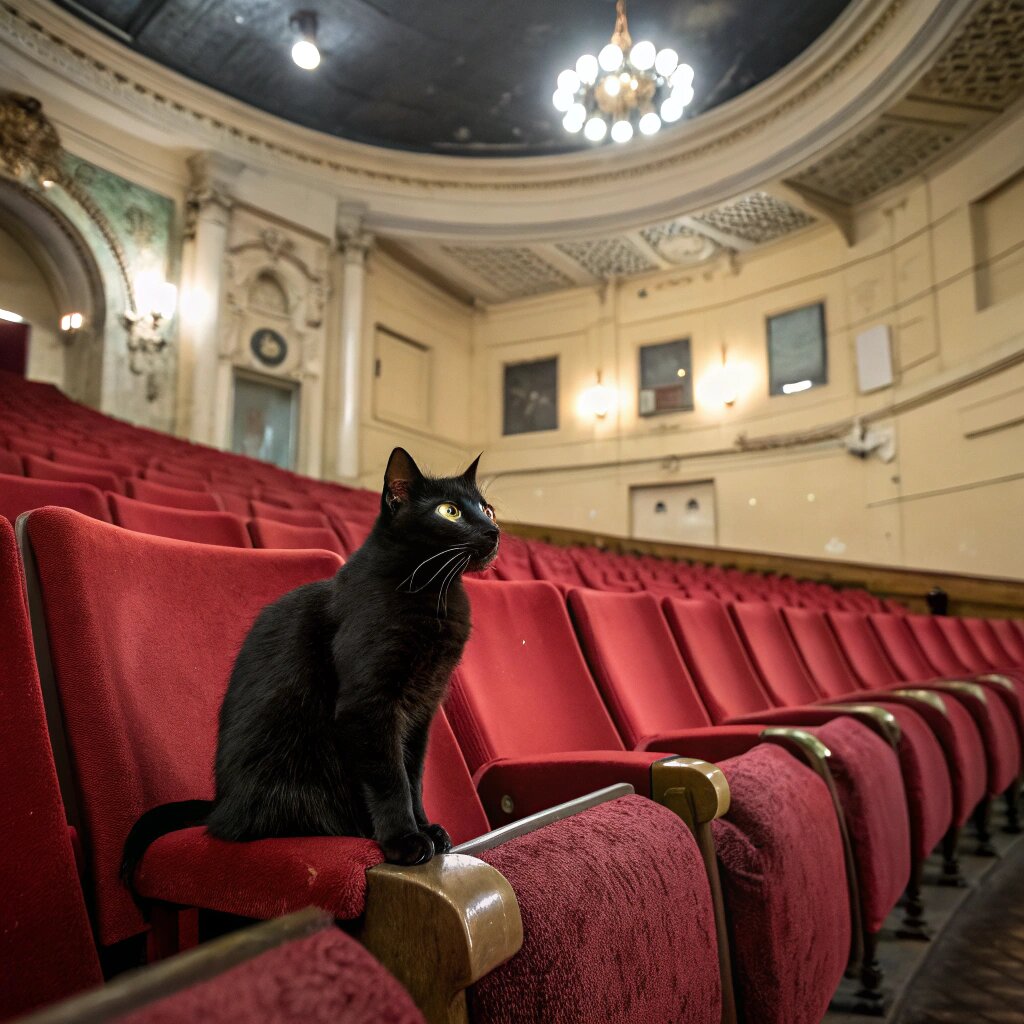 В театре имени Чехова, что стоит на тихой улочке старого города, уже пятнадцать лет живет черная кошка по имени Офелия. Никто точно не помнит, как она появилась — просто однажды утром обнаружили ее спящей в бархатном кресле партера, словно она всегда была частью этого места.