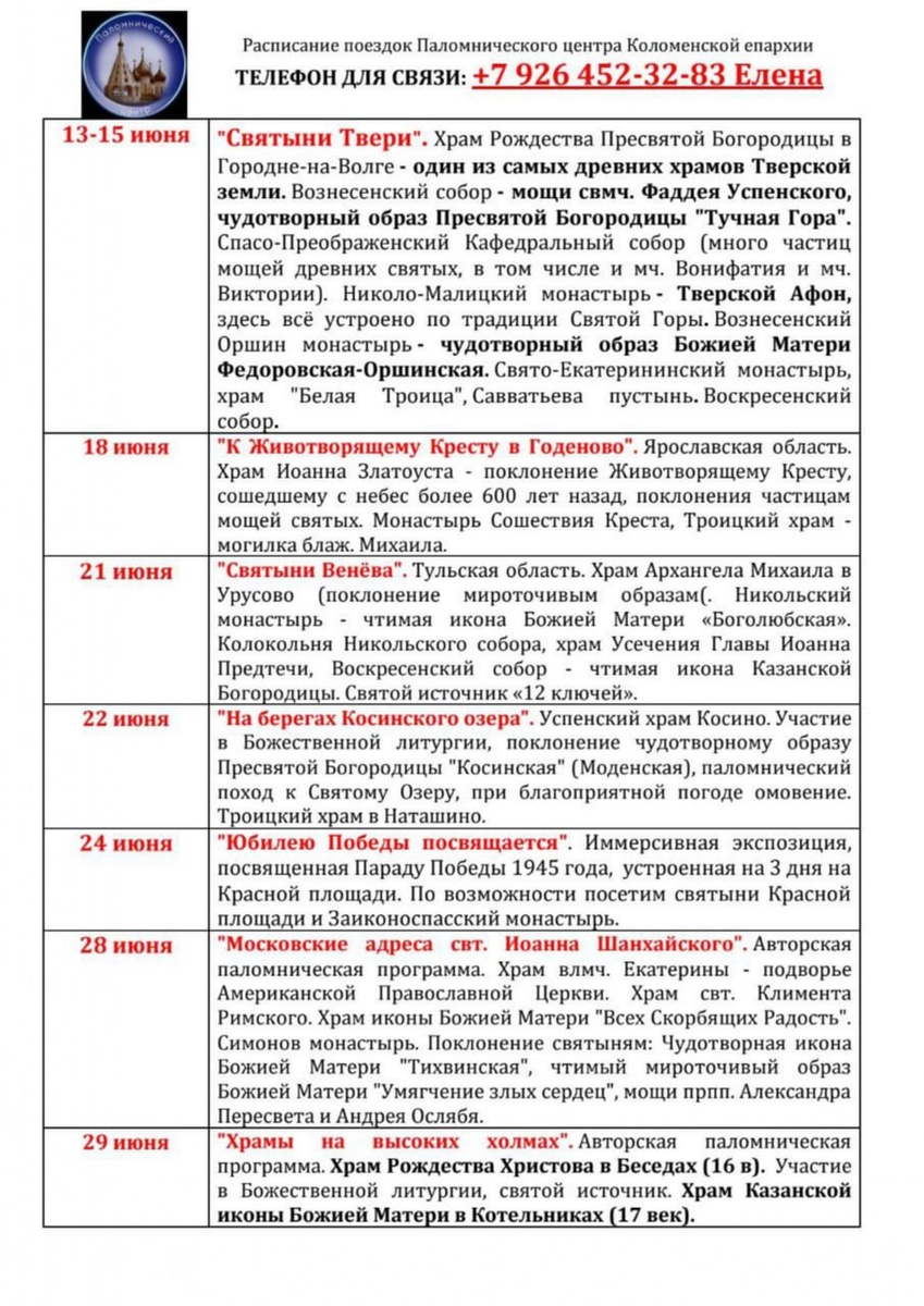 Расписание поездок Паломнического центра Коломенской епархии на июнь 2025 года