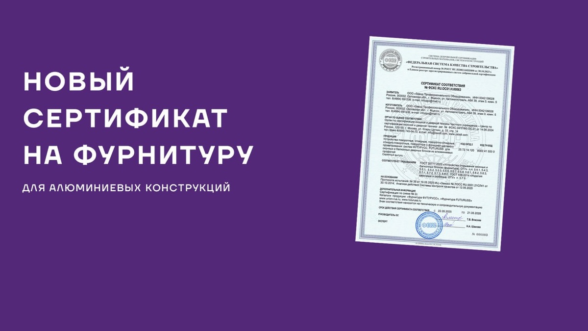 erid: 2SDnjeBev5b Сертификат на фурнитуру ФУТУРУСС: теперь и для алюминиевых конструкций Фурнитура ФУТУРУСС для алюминиевых окон прошла сертификационные испытания и получила официальный сертификат соответствия требованиям ГОСТ. Новинка для алюминиевых систем На выставке МосБилд 2025 компания ФУТУРУСС представила новую фурнитуру для окон и балконных блоков из алюминиевых профилей с 16-мм фурнитурным пазом. Это важный шаг в развитии продуктовой линейки и расширении сферы применения бренда. Испытания по ГОСТ — безупречный результат ФУТУРУСС провёл сертификационные испытания новой фурнитуры для подтверждения соответствия требованиям ГОСТ 30777 и ГОСТ 538. Испытания проводились в Центре по сертификации оконной и дверной техники – испытательном центре «ЗАМОК». • В рамках программы испытаний проверялись все параметры, предусмотренные ГОСТ: безотказность (наработка в циклах) – сопротивление статическим и динамическим нагрузкам • усилие и крутящий момент, прикладываемое к ручке • корроз