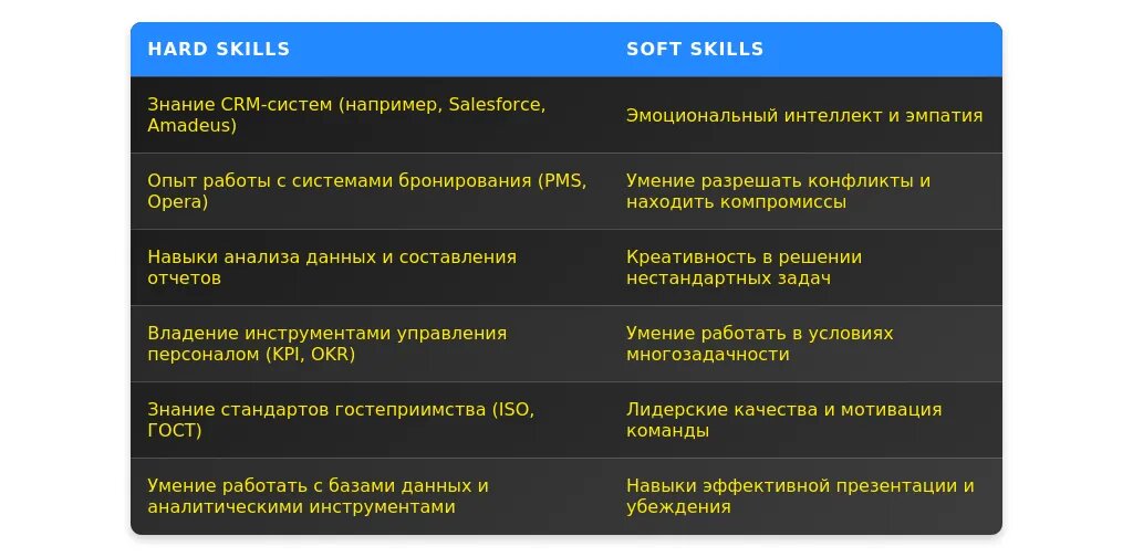 После адаптации: "Навыки работы с гостями, решение конфликтных ситуаций, организация мероприятий".