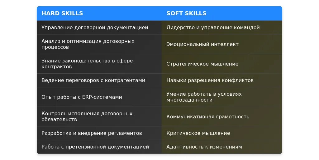 Знание международного договорного права, управление командой до 15 человек, опыт работы с CRM-системами (Salesforce, Bitrix24).