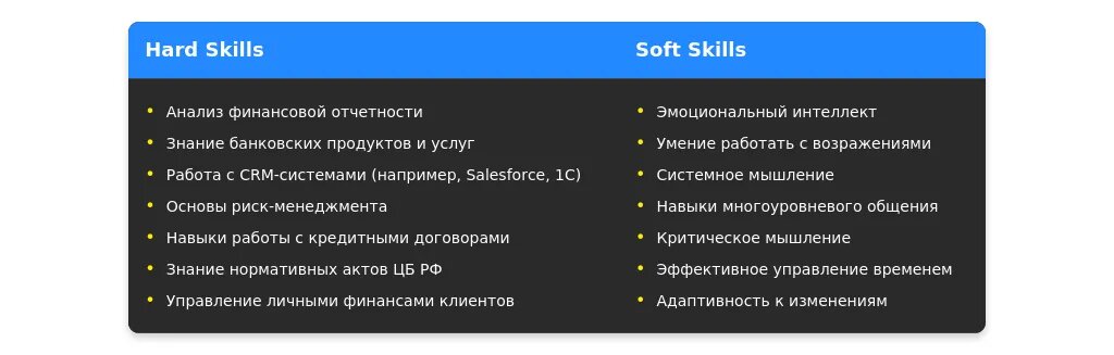 На что делать акцент: аналитические способности, коммуникативные навыки, знание банковских продуктов, умение работать с клиентами.