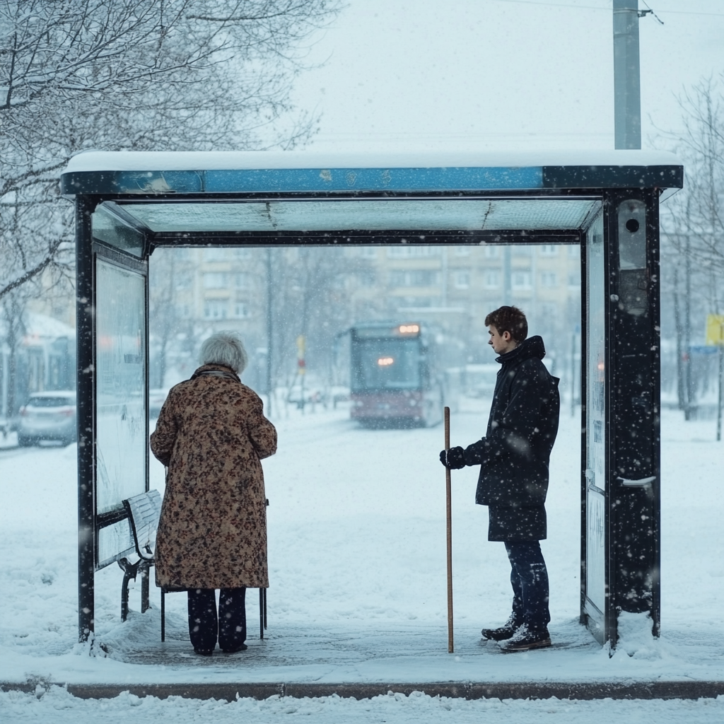 Зимний холод вгрызался в кожу, словно ледяные осколки злобного духа, проникая в самую душу. Автобусная остановка, одинокий страж среди белой пустыни, казалась заброшенным алтарем, где время застыло в янтарном плену, а жизнь едва теплилась в озябших конечностях. Деревья, облаченные в сверкающие латы инея, вели безмолвный диалог ветвями, словно хранители древней тайны, укрытой под снежным покрывалом.