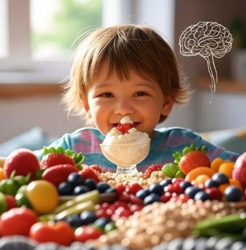 Пробиотики и пребиотики: поддержка иммунитета и мозга ребёнка 🧀 Пробиотики и пребиотики для детей (3–6 лет) — это как садовники, заботящиеся о здоровье кишечника, иммунитета и мозга. Они работают в команде, создавая баланс, который влияет на развитие и самочувствие. Здоровый кишечник — основа для ясного ума и крепкого иммунитета. Как они работают? - Пробиотики — полезные бактерии (например, в йогурте), которые укрепляют кишечную флору, защищая от инфекций. - Пребиотики — пища для этих бактерий (в бананах, овсянке), стимулирующая их рост. Вместе они поддерживают ось «кишечник-мозг»: улучшают настроение, память и устойчивость к болезням. Польза для ребёнка - Снижают риск аллергий и простуд. - Улучшают концентрацию и сон через выработку серотонина. - Помогают справляться с стрессом. Как включить в рацион? Добавьте в меню йогурт без сахара, бананы, цельнозерновую кашу. Это как топливо для маленького организма! 🍌 Кишечник — это не только пищеварение, а целый мир, влияющий на эмоции и