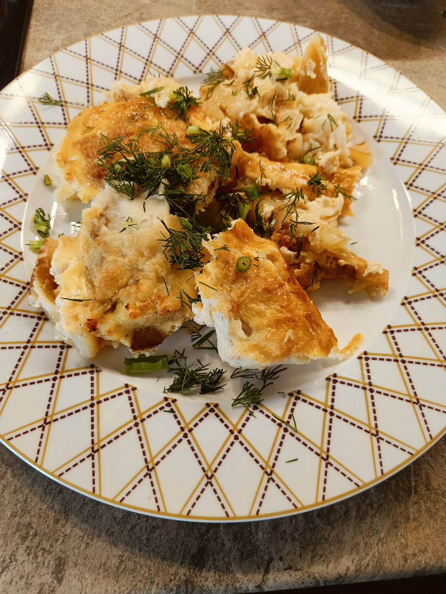 Минтай, запечённый в омлете с картофелем. Классное рыбное блюдо.