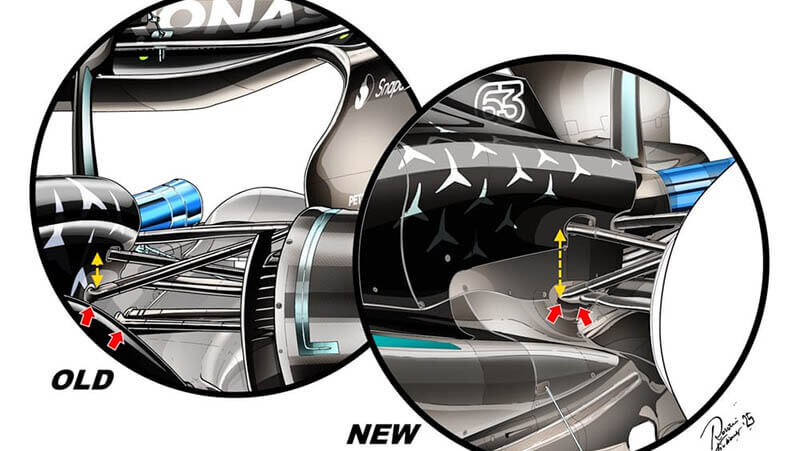 Еще одним интересным аспектом модернизации в Имоле от «Mercedes» стала конструкция переднего крыла, в которой было изменено расположение соединителей закрылков. С этим новым крылом «Mercede»s также вернулся к конструкции носовой части, которая простирается до основной плоскости, в отличие от более короткой носовой части, которую можно было увидеть в начале сезона.