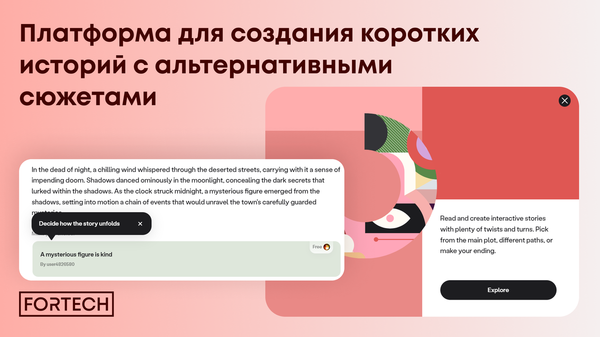 В современном мире цифрового контента читатели все чаще ищут новые форматы взаимодействия с историями — не просто пассивное потребление, а возможность влиять на сюжет, создавать альтернативные концовки или даже дополнять произведения своими идеями. Однако большинство платформ предлагают лишь линейное чтение, без инструментов для совместного творчества или интерактивности. Где же найти решение, которое объединит авторов и читателей в единой экосистеме, позволит монетизировать творчество и при этом сохранит простоту и удобство? Клиент — технологический стартап в области цифрового контента, который поставил перед собой амбициозную задачу: создать принципиально новый формат литературного творчества. Основная идея заключалась в объединении коротких историй (не более 1200 символов) с системой альтернативных сюжетных развитий, где каждый поворот сюжета ("твист") мог быть создан как автором оригинала, так и другими пользователями. При этом платформа должна была обеспечить удобные инструменты