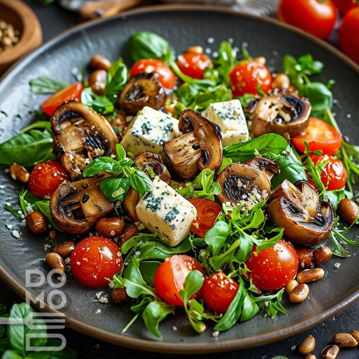 🍄 САЛАТ С ЖАРЕНЫМИ ШАМПИНЬОНАМИ И СЫРОМ ДОР БЛЮ Изысканное сочетание грибов, пикантного сыра и свежих овощей. ⏳ Время приготовления: 25 минут 🍽 Порция: 150 г 🔥 Калорийность: 320 ккал 🛒 ИНГРЕДИЕНТЫ Основные: • Шампиньоны – 76 г • Сыр Дор Блю – 20 г • Томаты черри – 30 г • Руккола – 9 г • Салат микс – 13 г • Кедровые орехи – 5 г • Пшеничный хлеб – 16 г Для маринада: • Соевый соус – 4 г • Растительное масло – 4 г • Чёрный перец – 0,05 г Для заправки: • Растительное масло – 7 г • Чеснок – 1 г • Лимонный сок – 0,5 г • Соевый соус – 1,5 г • Чёрный перец – 0,5 г 👩 ПОШАГОВЫЙ РЕЦЕПТ 1️⃣ Подготовка грибов 1. Нарежьте шампиньоны слайсами. 2. Замаринуйте в смеси соевого соуса, масла и перца на 20 минут. 3. Запеките при 200°C 5 минут. 2️⃣ Гренки и орехи 1. Хлеб нарежьте кубиками → подсушите в духовке. 2. Обжарьте орехи на сухой сковороде до золотистости. 3️⃣ Сборка салата 1. Смешайте рукколу и салат микс. 2. Добавьте: - Грибы - Кусочки сыра - Половинки черри 3. Полейте заправкой → по