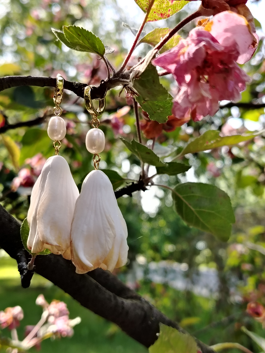Серьги созданы из полимерной глины, с использованием натурального жемчуга.