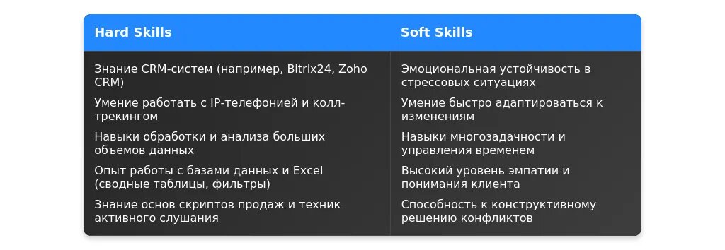 После адаптации: "Знание CRM-систем, обработка входящих звонков, навыки работы с клиентами, многозадачность."