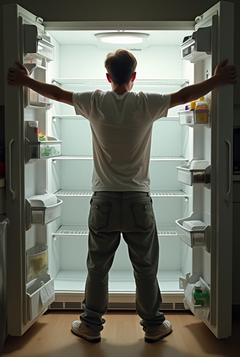 Дима вытер руки о майку, валявшуюся на стуле. В холодильнике зияла пустота — исчезли остатки вчерашнего борща, колбаса, которую он купил на завтрак, даже его йогурт с черникой. Остались только пустые банки из-под солёных огурцов и бутылка кефира с истёкшим сроком годности.