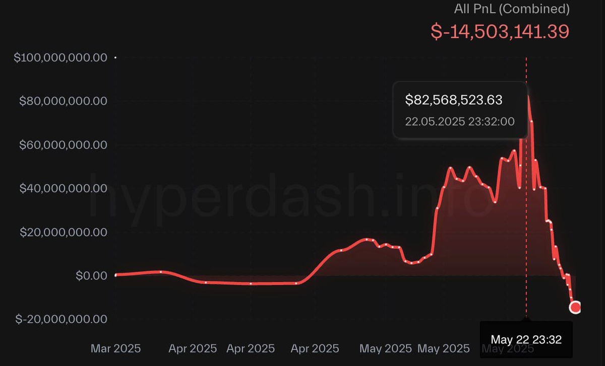 Трейдер James Wynn потерял $100 млн после падения биткоина А наш БОТ потихоньку работает 🪙 Анонимный трейдер под псевдонимом James Wynn потерял более 1 000 BTC (около $110 млн) в торговых позициях с высоким кредитным плечом, когда рынок пошел против него. Он стал известен благодаря агрессивной стратегии с максимальными плечами, торгуя на децентрализованной бирже Hyperliquid. 21 мая он открыл лонг по биткоину на $830 млн с плечом 40x, позже увеличив его до $1,25 млрд по средней цене $108 243. Сделку он закрыл с убытком и продолжил торговать, но большинство новых позиций также оказались убыточными. 30 мая на фоне резкого падения биткоина у него были принудительно закрыты лонги более чем на 1 040 BTC. По данным Hyperdash, у него были ликвидированы позиции: 527 BTC по $104 950, 422 BTC по $104 150 и 96 BTC по $104 620. Нереализованная прибыль трейдера от всех его сделок в моменте превышала $82 млн, сейчас же у него зафиксирован убыток $14,5 млн. Wynn публиковал сделки в X, его посты