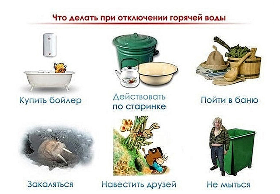 Помню, как когда-то в советское время горячую воду отключали на месяц. У нас тогда была газовая плита на 4 конфорки, и на двух дальних постоянно стоял большой бак литров на 20. Оттуда брали горячую воду, которую подогревали, и доливали холодную. Ну, а чтобы помыться целиком, нужно было таскать ковшики и тазики в ванную.