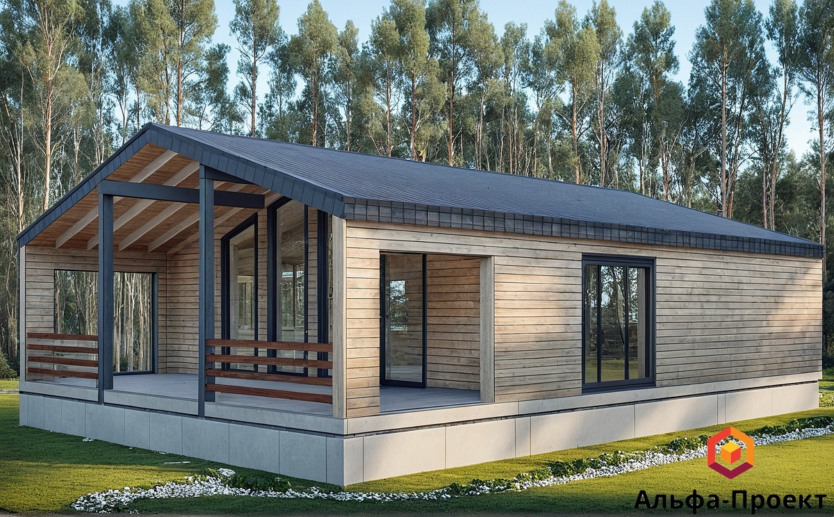 Представьте: вы – владелец не просто дома, а архитектурного шедевра! Наш готовый проект одноэтажного каркасного дома в стиле Барнхаус площадью 103 м² – это смелое сочетание лаконичной эстетики, простора и невероятного уюта. С его четкими линиями и панорамными окнами, он словно сошел со страниц модного журнала, но при этом создан для реальной, комфортной жизни. Размеры дома 8,36х12,28 метров уже включают в себя великолепную, просторную террасу! Забудьте о лестницах! Вся магия этого проекта Барнхауса разворачивается на одном этаже. А его жемчужина – это, без сомнения, огромная терраса площадью 24,18 м²! Это ваша личная лаунж-зона под открытым небом, место для утреннего кофе под пение птиц, шумных семейных обедов или романтических вечеров под звездами. Она органично продолжает жилое пространство, стирая границы между домом и природой. Мы позаботились, чтобы ваш каркасный Барнхаус 103 м² был не только красивым, но и теплым: Этот энергоэффективный проект дома позволит вам наслаждаться жизн