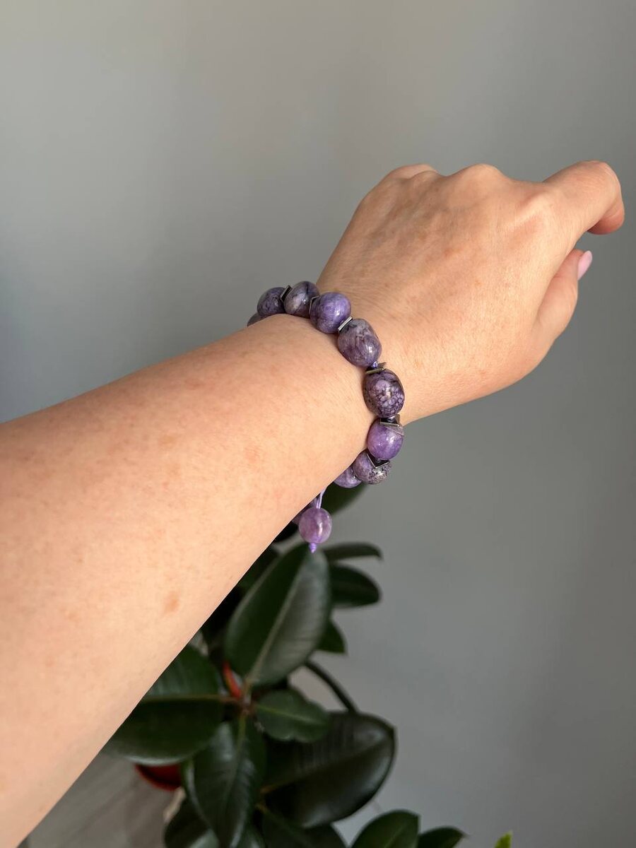 ✨ Браслет на шнуре с кварцем Кварц, искусно тонированный под чароит, завораживает своими сиренево-фиолетовыми оттенками и глубокими мраморными переливами. Каждый камень — как фрагмент космоса на запястье. Даже в имитации этот камень несёт в себе особую энергию спокойствия и вдохновения. Благодаря прочному регулируемому шнуру браслет удобно сидит на руке и подойдёт как мужчинам, так и женщинам. Отличный выбор для подарка или стильного акцента в повседневном образе. 🔮 Детали: — Камень: кварц, тонированный под чароит — Цвет: фиолетовый, сиреневый, с уникальными прожилками — Основа: прочный шнур, легко регулируется по размеру — Унисекс: подходит для всех — Энергия: гармония, интуиция, внутреннее обновление Носи с настроением 💜 Цена 1600₽ Для заказа ✍️🤳+79608555077 #натуральныекамни #браслетнашнуре #украшенияизнатуральныкамней
