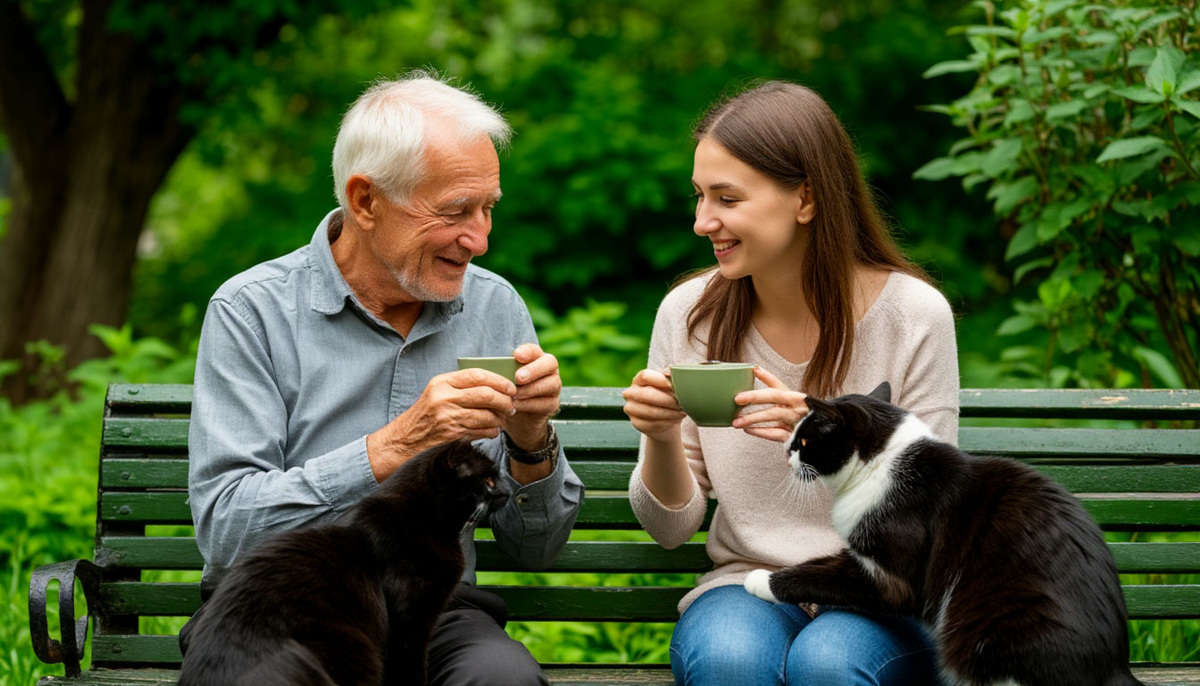 Сосед снизу, пожилой мужчина по имени Виктор Петрович, вышел во двор и принялся кормить бездомного кота. Анна видела его часто — он жил один, ходил медленно, с тростью, но всегда улыбался прохожим. Кот, черный с белой лапкой, терся о его ноги, громко мурлыча.