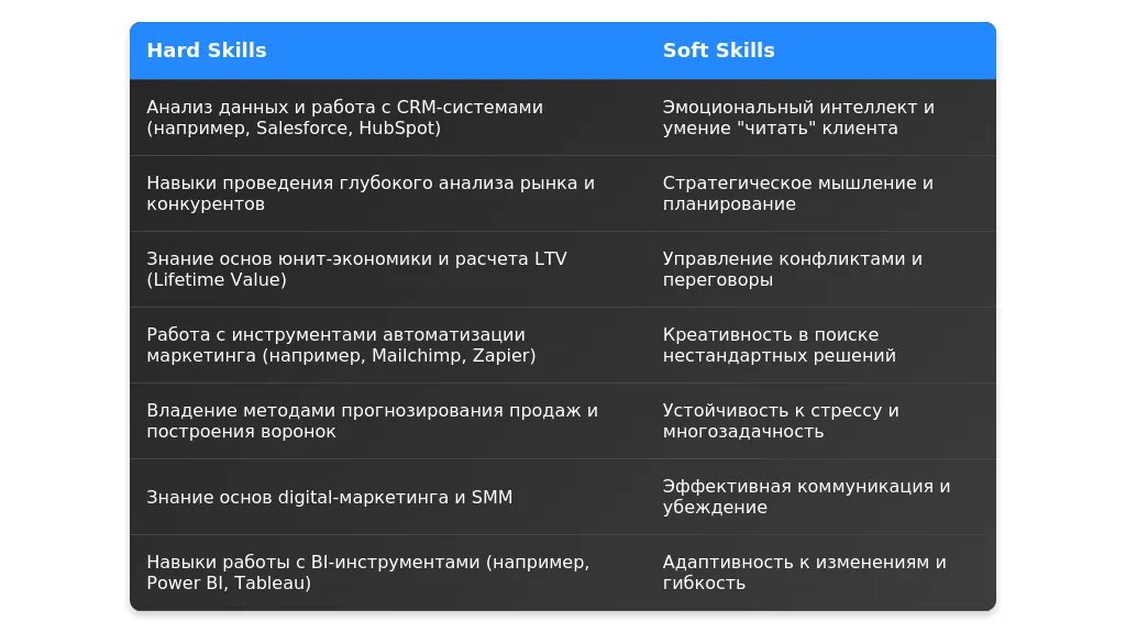 - Ключевые навыки (коммуникация, переговоры, CRM-системы).