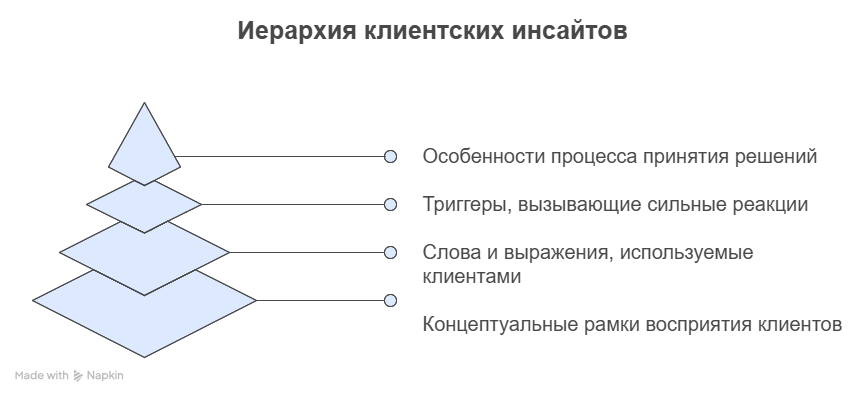 Языковые инсайты – конкретные слова и выражения, которые клиенты используют при описании проблем. В сфере HR-технологий клиенты говорят «инструмент против рутины» вместо «система оптимизации подбора персонала». Эти естественные формулировки вызывают гораздо больший отклик у целевой аудитории.