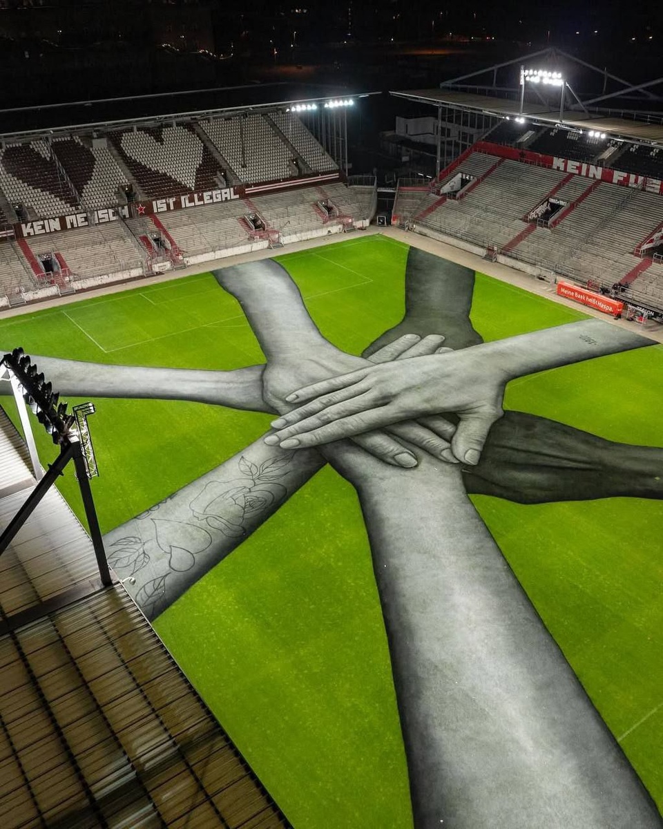 На стадионе «Санкт-Паули» в Германии растянули мощный мурал – символ единства. Затем с этим принтом сделают мерч на продажу, а выручка пойдет на помощь тем, кто нуждается в чистой питьевой воде. Таких миллионы.